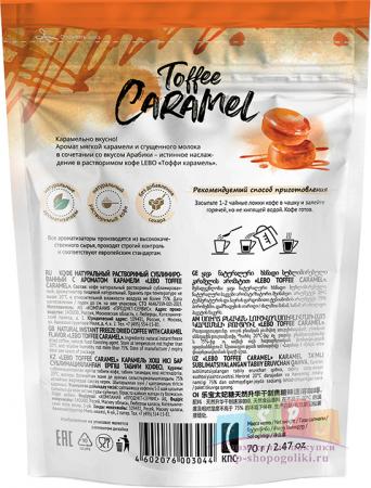 Описание: Кофе натуральный растворимый ароматизированный. Вкус: Карамель.Сливочные ноты нежной ириски идеально сплетаются с насыщенным и ярким вкусом бразильской арабики, создавая настоящее удовольствие, которое можно разлить по чашкам. Выбирайте LEBО.