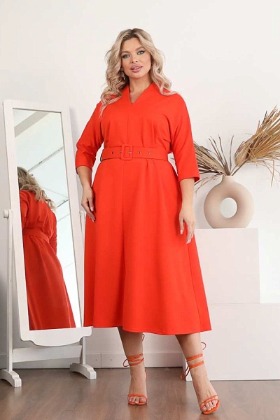 Описание: Стильное платье свободного силуэта из трикотажного полотна оранжевого цвета. V-образный вырез изделия обработан внутренней обтачкой. Платье с цельнокроеными рукавами. В комплект входит пояс. Длина изделия по спинке от плечевого шва до низа изделия — 120 см. Рост фотомодели — 170 см.