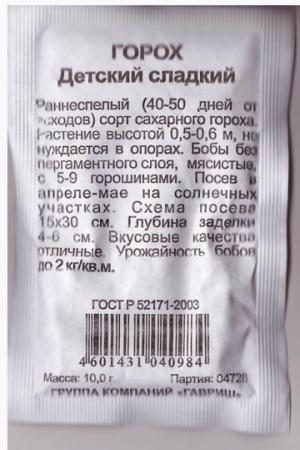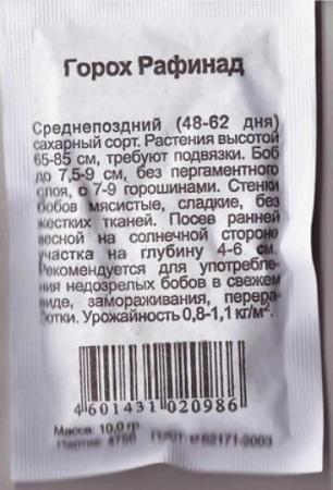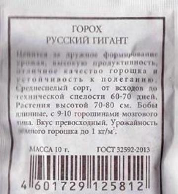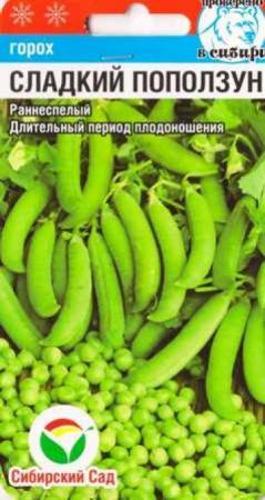 <p>Среднеспелый сахарный сорт, без пергаментного слоя. Высота растения 70-76 см. Боб без пергаментного слоя, длиной 8-10 см с 7-8 сладкими горошинами диаметром 9-10 мм. Стебель прямостоячий, устойчив к полеганию. Вкусовые качества великолепные. Длительная отдача урожая. При перезревании сохраняет сладость. Болезнеустойчив. Высокоурожайный. Особенности выращивания: Горох выращивают на любой почве. Высевают рано весной на хорошо освещенных участках.</p> <p>Фасовка 4г</p> </div>