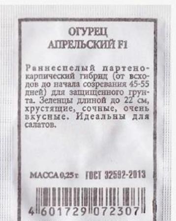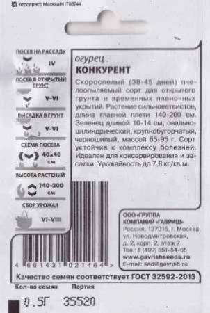 <p>Скороспелый (42-45 дней от всходов до начала плодоношения) партенокарпический гибрид для выращивания в теплицах, открытом грунте и под временными пленочными укрытиями. Растение среднерослое, средневетвистое, с букетным заложением завязей (по 2-4 шт. на главном побеге и до 8 шт. на боковых). Зеленцы ярко-зеленые, цилиндрические, длиной 10-12 см, диаметром 3,5-4,0 см, массой 90-100 г, бугорчатые, белошипые. Гибрид дружно плодоносит, устойчив к основным заболеваниям огурцов. Корнишоны одинаковые по размеру, очень ароматные, прочные, лежкие, прекрасно подойдут для бочковой засолки, маринования и приготовления свежих салатов. Урожайность — 10,3-11,5 кг/м2. Посев на рассаду — в конце апреля. Высадка рассады в грунт — в конце мая – начале июня в фазе 3-4-х настоящих листьев. Посев непосредственно в грунт – в мае – июне. Схема посадки: 30х70 см.</p> <p>Фасовка 10шт</p> </div>