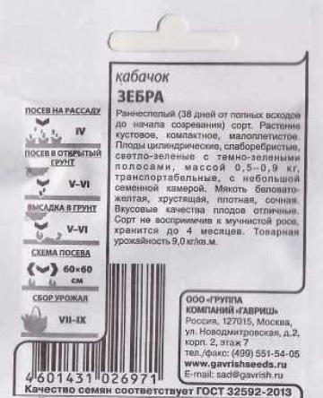 <p>Новый холодостойкий сорт. Характеризуется быстрым ростом, устойчивостью к засухе и комплексу болезней. Среднеранний, первые плоды можно собрать на 45-55 день от всходов. Период плодоношения составляет в среднем 1,5 месяца. Растения кустовые. На кусте формируется большое количество женских цветков, что дает обильный урожай. Для сезонной кулинарии собирают молодые плоды 15-20 см длиной, для заготовок икры подходят плоды покрупнее, массой 0,6-1,2 кг. Мякоть плодов нежная, сладковатая. Урожайность стабильно высокая – 8-10 кг/м 2 . Некоторое количество излишних цветков рекомендуем приготовить в кляре – это вкусно и необычно.</p> <p>Фасовка 2г</p> </div>
