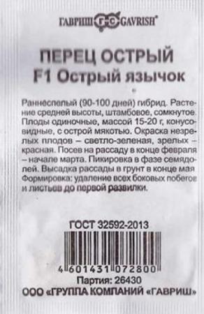 <p>Очень острый высокоурожайный сорт. Среднеспелый сорт для открытого грунта и пленочных теплиц. Период от всходов до начала созревания 110-120 дней. Куст высотой 55-70 см. Плоды пониклые, удлинено –хоботовидные, слабоморщинистые. Окраска в технической спелости зеленая, в биологической – красная. Длина плода 25-30 см. Имеет очень острый вкус и сильный перечный аромат. Используют как приправу к блюдам, в качестве специй при квашении, мариновании и консервации. Плоды могут хранится до 1 месяца, не теряя своих качеств.</p> <p>Фасовка 0,1г</p> </div>