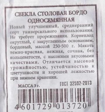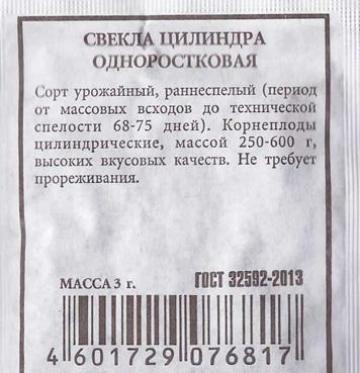 <p>Новый, среднеспелый сорт (период от полных всходов до начала технической спелости 110-115 дней) с идеально выровненными корнеплодами. Необычайно привлекательный внешний вид этой свеклы сочетается с превосходными вкусовыми качествами. Её фиолетовая мякоть очень сладкая и нежная, без колец и грубых волокон. Цилиндрические корнеплоды массой 160-310 г хорошо хранятся в течение зимы без потери вкусовых качеств. Незаменима для детского и диетического питания. </p> <p>Фасовка 3г</p> </div>
