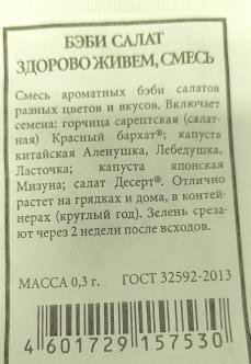 <p>Специальная смесь скороспелых листовых овощей для выращивания продукции бэби- лиф. В пищу используют молодые растения в фазе 3-5 настоящих листьев. Компоненты: разноцветные салаты Анапчанин, Дубачек МС, Коралл, Лолло Росса, Эврика, корн-салат, индау (руккола) Диковина. Чтобы получать зелень в непрерывном режиме, проводят повторные посевы с интервалом 10-15 дней. </p> <p>Фасовка 0,5г</p> </div>