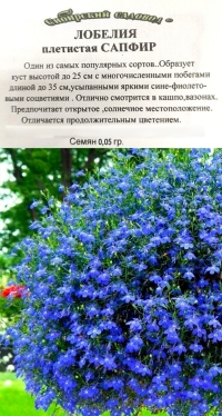 Наименование:Лобелия Сапфир плетистая ч/б Цена: 8.9 руб Описание: Один из самых популярных сортов .Образует куст высотой до 25 смс многочисленными побегами длиной до 35 см, усыпанными яркими сине-фиолетовыми соцветиями. Отлично смотрится в кашпо, вазонах. Предпочитает открытое, солнечное местоположение. Отличается продолжительным цветением. Посев на рассаду в феврале-марте под стекло.