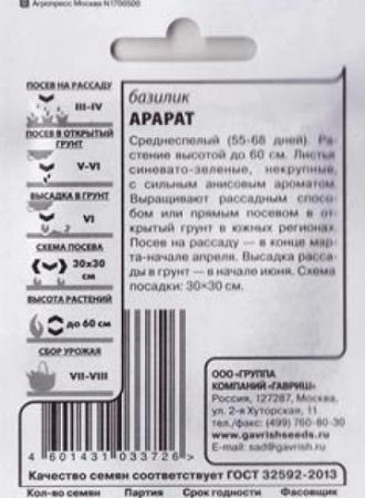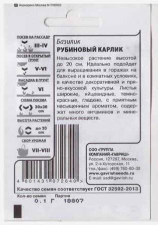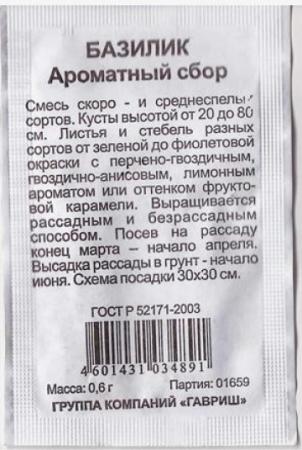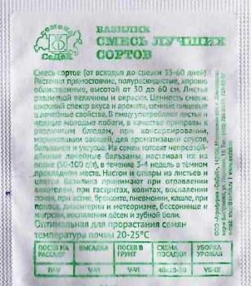 <p>Очень декоративный сорт зеленого базилика. Растение формирует компактные кустики высотой 35-40 см. Листья мелкие, гладкие, оливково-зеленые, с приятным вкусом и ароматом аниса, содержат много витаминов и минерльных веществ. Используют в качестве салатной зелени, приправы к мясным и рыбным блюдам. Базилик обладает тонизирующими свойствами, улучшает пищеварение. Выращивают рассадным способом или прямым посевом в открытый грунт. Посев на рассаду производят в конце марта – начале апреля. Посев в грунт в мае или начале июня. Высадка рассады в грунт – начало июня. Схема посадки 30x30 см. Предпочитает хорошо структурированные, богатые гумусом почвы. Нуждается в регулярных поливах.</p> <p>Фасовка 0,1г</p> </div>