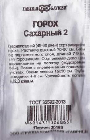 <p>Среднеранний (55-65 дней от всходов до созревания) сорт сахарного гороха. Растение высотой до 100 см. Бобы светло-зелёного цвета, без пергаментного слоя, длиной 10 см с 5-7 выровненными по размеру горошинами. Стенки бобов толстые, мясистые, сахарные. Это ценный диетический продукт, богатый белками, сахарами, крахмалом, витаминами и каротином. Рекомендуется для употребления недозрелых бобов в свежем виде. Сахарные «лопатки» вместе с сочными горошинами доставят немало удовольствия детям и взрослым. Посев ранней весной на солнечной стороне участка, на глубину 4-6 см. Схема посева 15x30 см. Требуется опора. Сбор урожая в июле-августе. Урожайность 0,8-1,3 кг/м2.</p>