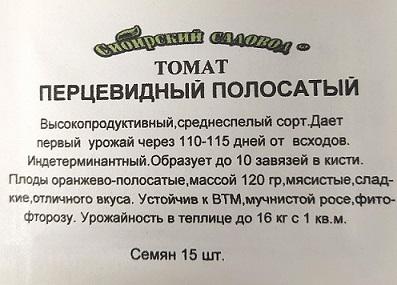 <p>Уникальный сорт с перцевидными плодами полосатой окраски. Среднеспелый, от всходов до первого сбора урожая 110-115 дней. В средней полосе для теплиц, в южных регионах для открытого грунта. Растения индетерминантные, высотой в теплице 170-190 см. Первая кисть закладыва ется над 8 листом, последующие – через 2 листа. Плоды массой 100-120 г (некоторые до 200 г), плотные, отличного вкуса. Придадут изысканность любому салату и сэндвичу. Томаты небольшого размера идеальны для консервирования. Сорт устойчив к ВТМ, фузариозному увяданию. Урожайность в теплице 9-10 кг/м2.</p> <p>Фасовка 20шт</p> </div>