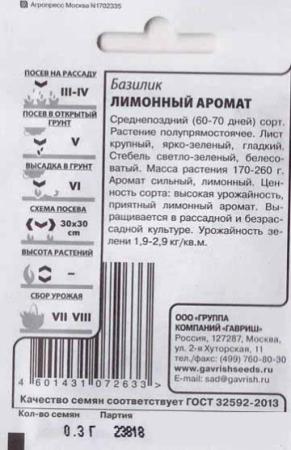 <p>Раннеспелый сорт. Растение компактное, хорошо облиственное, высотой 50-60 см. Листья зеленые, овальные, с приятным цитрусовым ароматом. Масса одного растения 200-250 г. Требователен к теплу и свету, высаживается на защищенных от холодных ветров и хорошо освещенных солнечных местах. Влаголюбив и отзывчив к внесению азотных удобрений, увеличивающих урожай зеленой массы. Для лучшей кустистости растения прищипывают. Ценность сорта: быстрый рост, высокая урожайность, сильно выраженный лимонный аромат. Используют для гарниров, в качестве пряно-вкусовой добавки к блюдам и при консервировании, для ароматизации напитков, уксуса, масла. Применяют как лечебное и профилактическое средство при заболеваниях почек и желчного пузыря. </p> <p>Фасовка 0,2г</p> </div>