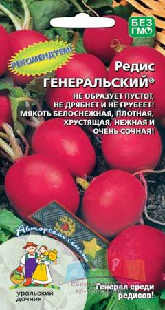 Наименование:8022N Редис Генеральский 2гр Цена: 20.88 руб Описание: Раннеспелый высокоурожайный сорт. Период от полных всходов до технической спелости всего 25 дней. Розетка листьев низкая, компактная. Корнеплоды невообразимо красивые: с блеском, ровные, округлой формы, тёмно-красного цвета, диаметром до 4 см, массой до 30 г. Мякоть белоснежная, плотная, хрустящая, нежная и очень сочная, с повышенным содержанием витаминов. Не образует пустот, не дрябнет и не грубеет. Сорт устойчив к цветушности, не растрескивается, хорошо переносит высокие и низкие температуры. Редис высевают в несколько сроков, с конца апреля (грядку укрывают пленкой до появления всходов), в дальнейшем, при необходимости, посевы проводят с интервалом 2-3 недели. Осенние посадки дают более крупные корнеплоды. Семена высевают в рядки с междурядьями 10-12 см, расстояние между семенами 2-3 см, глубина посева 1-1,5 см. В разгар лета, при самом длинном световом дне, посадки необходимо притенять. Полив регулярный, через 2-3 дня, в сухую погоду — ежедневно. Необходимо своевременно производить уборку.