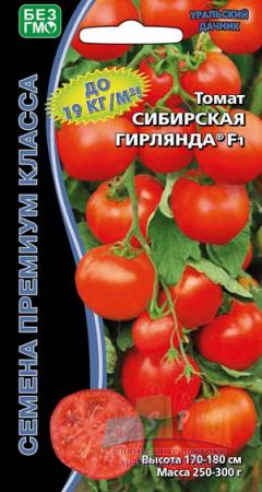 Наименование:8037N Томат Сибирская гирлянда F1 10шт Цена: 43.25 руб Описание: Экстремально ранний гибрид, период от всходов до начала созревания 90-95 дней. Растение мощное, высотой 170-180 см, формировать следует не менее чем в 2 ствола. Первая кисть закладывается над 6-м листом, последующие через 2-3 листа. Кисть с 6-8 плодами, на растении формируется 10-11 кистей — всё это великолепие выглядит просто завораживающе, кисти как настоящие гирлянды с яркими плодами. Плоды интенсивно красной окраски, округлые, гладкие, плотные, массой 250-300г, сочетающие наивысшие вкусовые качества с транспортабельностью. Урожайность стандартных плодов умопомрачительная 17-19 кг/м?. Рекомендуется для получения ранней продукции в плёночных теплицах и открытом грунте в шпалерной культуре.