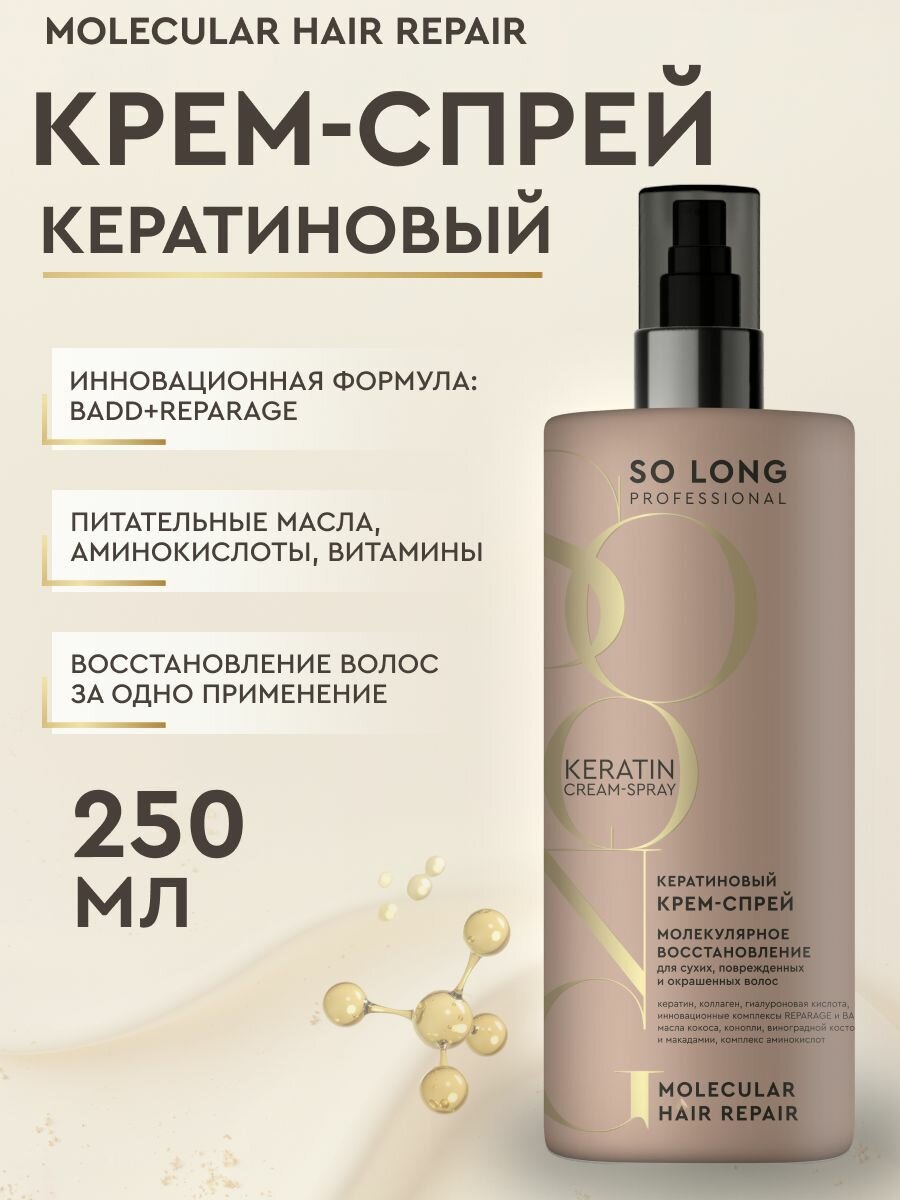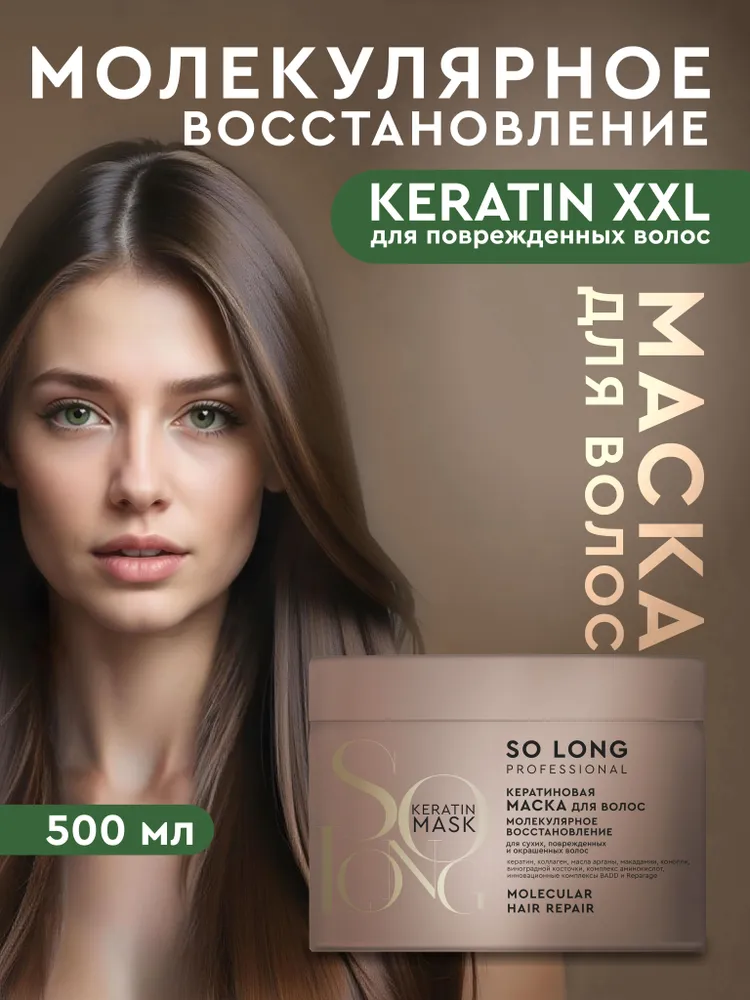 Описание: рофессиональная кератиновая маска для волос «Молекулярное Восстановление» от бренда SO LONG PROFESSIONAL Подарите своим волосам роскошь профессионального ухода с нашей кератиновой маской, специально разработанной для сухих, поврежденных и окрашенных волос. Благодаря уникальной формуле, насыщенной активными компонентами, вы получите мгновенное восстановление, гладкость и блеск. • Глубокое Восстановление: Гидролизованный кератин проникает в структуру волоса, заполняя поврежденные участки и предотвращая ломкость. • Запатентованный Комплекс ReparAge: Уникальный Амино-Структурный Матрикс восстанавливает микро- и макроповреждения, придавая волосам прочность и упругость. • Инновационный Комплекс BADD: Восстанавливает дисульфидные связи, возвращая волосам здоровье и жизненную силу. • Коллаген и Гиалуроновая Кислота: Обеспечивают гладкость, эластичность и объем, наполняя волосы влагой. • Натуральные Масла: Глубоко питают и укрепляют волосы, даря им мягкость и шелковистость. • Аминокислотный Комплекс: Повышает плотность и прочность волос, возвращая им жизненную силу. С нашей кератиновой маской вы забудете о секущихся кончиках и трудностях с расчесыванием. Дайте своим волосам то, что они заслуживают — профессиональный уход, который преобразит их в идеальные локоны!