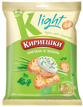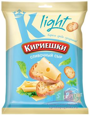 Наименование:«Кириешки Light», сухарики со вкусом сливочного сыра, 80г Цена: 25.4 руб Описание: Низкокалорийные сухарики с тонким вкусом сливочного сыра. «Кириешки Light» – сухарики нового поколения, изготовленные по уникальной технологии «Сrispy Light», обеспечивающей хруст и легкость. В основе сухариков кукурузная мука, сбалансированная по составу жиров, белков, углеводов и обогащенная клетчаткой. Современная технология сохраняет неповторимый вкус сухариков. Низкокалорийные сухарики – легкий снек для перекуса и отличная закуска к пенным напиткам. Но их можно использовать и в кулинарии. – Если смешать вареные яйца, соленые огурчики, сыр и сухарики и приправить из майонезным соусом с чесноком, получится аппетитный салат.