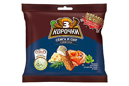 Наименование:«Кириешки», сухарики со вкусом ветчины и сыра, 100г Цена: 24.6 руб Описание: Ржано-пшеничные сухарики со вкусом ветчины с сыром. Для «Кириешек» используется свежеиспеченный хлеб. Сухарики производят без обжарки во фритюре. Современная технология сохраняет полезные свойства злаковых культур и обеспечивает сухарикам незабываемый вкус. Ржано-пшеничные сухарики – легкий снек для перекуса и отличная закуска к пенным напиткам. Но их можно использовать и в кулинарии. – Ароматные сухарики придадут вкусовую и эстетическую завершённость разнообразным супам-пюре (тыквенному, грибному, сырному, супу из цветной капусты и многим другим). – Хрустящие сухарики в дуэте с кунжутными зернами отлично дополнят салат из рукколы, помидорок черри и сыра пармезан.