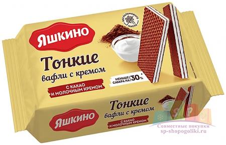 Наименование:«Яшкино», вафли тонкие с какао и молочным кремом, 144 г Цена: 57 руб Описание: Хрустящие воздушные вафельки с натуральным какао и кремовой прослойкой с молочным вкусом. Это новая версия лакомства от «Яшкино» – с пониженным содержанием сахара, с кремом на кокосовом масле и уменьшенным количеством вафельных слоев.